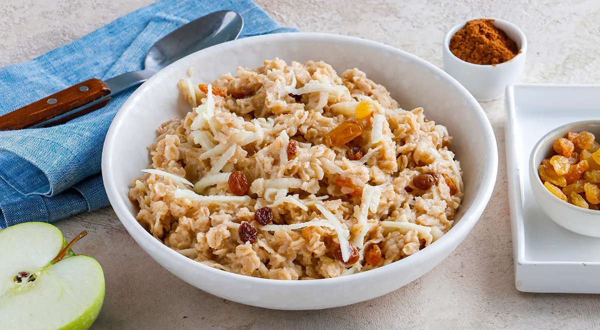 Fulgi de ovăz, lapte sau băutură vegetală și scorțișoară.